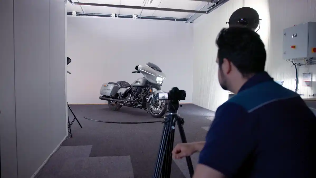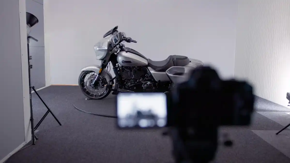 In addition, the system ensures consistent photography. Every motorcycle is captured from the same angles, resulting in a uniform appearance across websites and sales platforms.